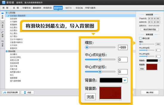 首先,打开爱剪辑,点击“添加视频”按钮,导入软件自带的黑幕视频。接着给黑幕视频应用“画面风格”-“自由缩放(画面裁剪)”功能。将“缩放”滑块拉到最左边,然后导入一张背景图,背景视频就制作好了。