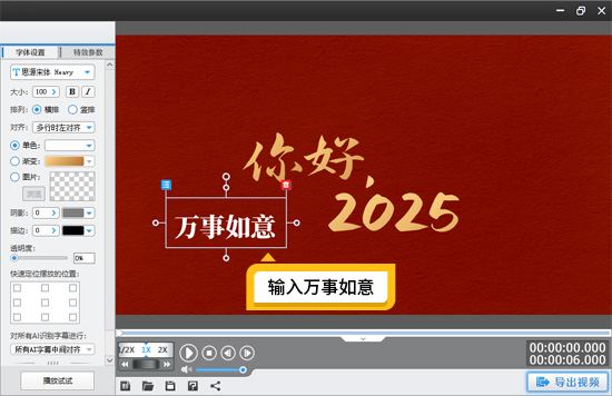 接下来,把操作界面切换至“字幕特效”面板,在视频预览框内双击鼠标左键,此时会弹出字幕输入框,在框内输入醒目的“你好,2025”字样。为了凸显标题的庄重与华丽,将字体大小设置为280,渐变颜色选定为金色,使之熠熠生辉。在特效设置区域,取消对“出现特效”和“消失特效”的勾选,仅在“停留特效”列表中选择“静态展示”这一特效,并将其特效时长精确地设置为6秒,通过这样的设置,让标题能够稳稳地处于画面中心位置,以一种简洁而大气的方式开启新年祝福的篇章。