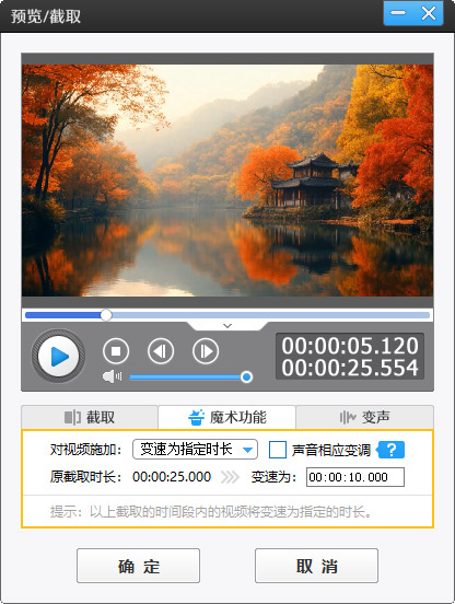 在“已添加片段”列表中,双击需要加速的视频缩略图,会弹出“预览/截取”对话框。在对话框中,通过拖动时间轴上的滑块,或者使用左右方向键进行五秒微调、上下方向键逐帧选取,设置好需要加速片段的开始时间和结束时间,点击“确定”即可选中该片段。