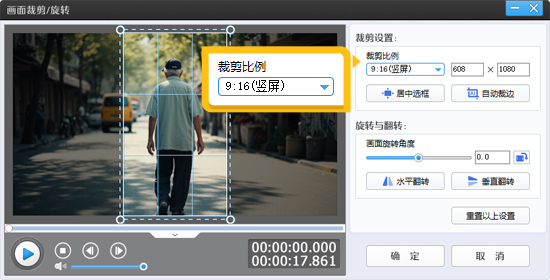 打开爱剪辑软件,导入横屏视频后,点击左下角的“画面裁剪/旋转”按钮,进入AI画面裁剪面板,选择裁剪比例为9:16,将横屏视频裁剪成竖屏比例,同时利用AI智能裁剪特性,软件会自动优化裁剪后的画面,保证核心内容完整且清晰。若视频中有主体人物或关键场景,还可以通过精确调整裁剪框,让其处于画面中心位置,呈现最佳视觉效果。