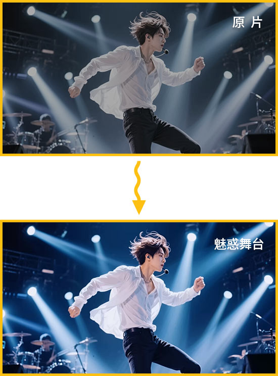 爱剪辑里面内置了上百种电影级调色效果,可以一键应用,让你轻松获得大片调色效果。比如:可以应用“魅惑舞台”,应用在动感视频上面。此外还有“都市暗流”、“一键高级调色”等。